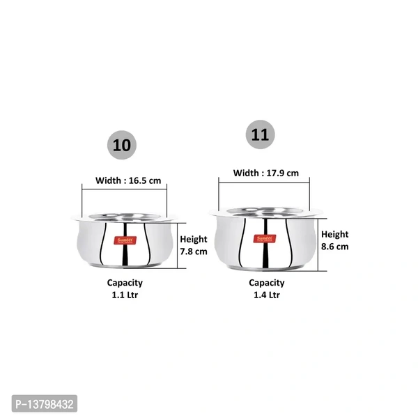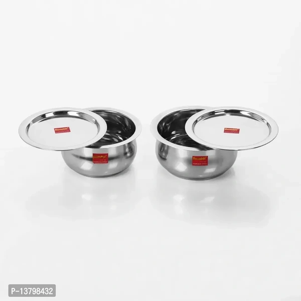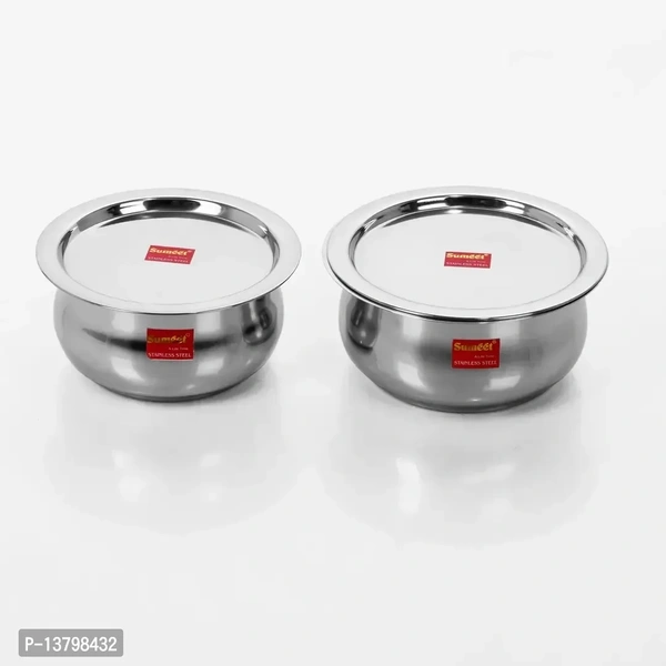 Cooking is one of the great pleasures of life the right cookware is an essential ingredient for good cooking thats why Sumeet has brought together one of the most comprehensive ranges of quality cookware. Hence taking care of all your kitchen needs Sumeet Stainless Steel Rust free Cookware are carefully designed and fabricated with compliance with industry standards. The set contains 2 topes + 2 lids. This set of topes (pots) are durable for everyday cooking and preserves nutrition so your recipes turn out beautifully. This light weight Belly shape tope set is designed with flat bottom base that helps distribute heat evenly and quickly throughout the vessel and keeps the food in it warm for a longer duration. Compaq size makes it easy to store in kitchen cupboards. When not in used smaller container can be stacked inside bigger container saving lot of storage space. With a very fine finish, it Consumes low gas, oil saver, cooks faster and look great in kitchen.